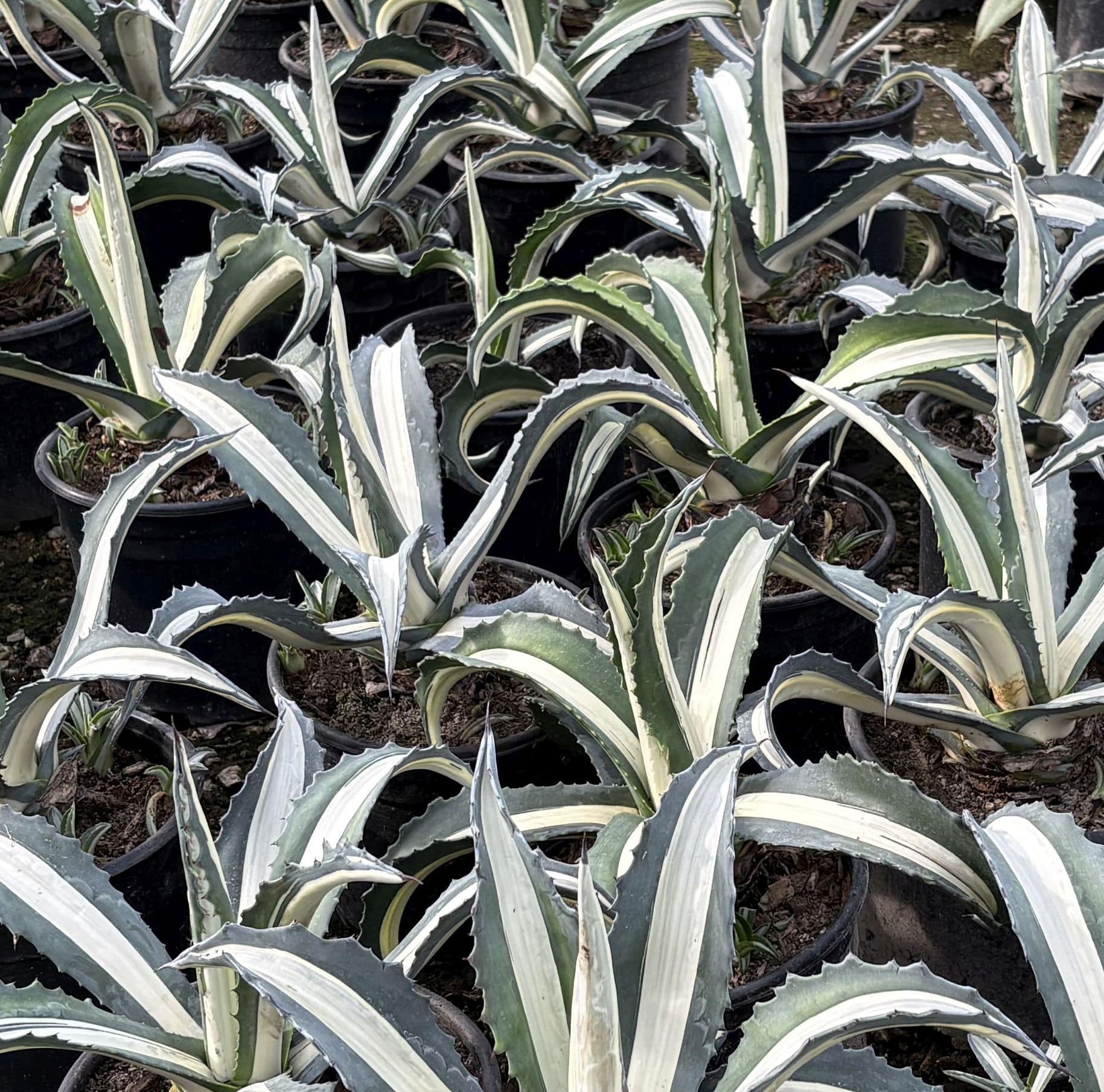 Agave americana var. medio-picta ‘Alba’ es una suculenta variegada de tamaño mediano con franjas centrales de color blanco crema y márgenes espinosos de color azul verdoso. Ideal para paisajes desérticos y costeros, como ejemplar único y en jardines de suculentas. Debido a sus espinas afiladas, es eficaz como seto bajo de barrera. Crece mejor en suelos arenosos, pobres o rocosos; necesita buen drenaje. Monocárpica. Resistente a ciervos y conejos. Resistente al fuego. Resistente al frío hasta 15°F.