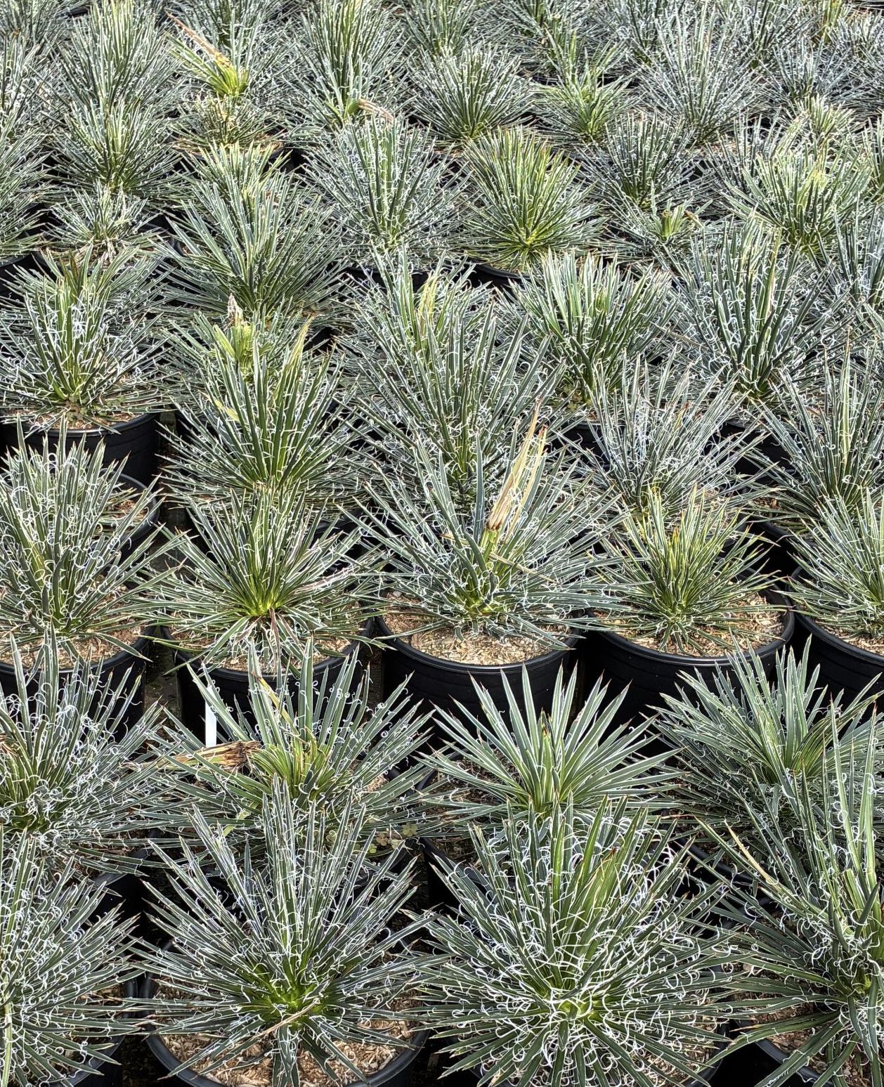 Agave geminiflora is a slow-growing succulent known for its dense, symmetrical, 2-3′ rosette of narrow, dark green, flexible leaves with white, curly filaments on the leaf edges. It blooms once every 10-15 years, sending up a 12-18′ spike with yellow-green flowers. Ideal for xeriscaping, rock gardens, accents, mass plantings. It does not have a terminal leaf spine, so it works well in high-traffic areas. Best in full sun, but tolerates shade. Leaves will be stiffer in sun, softer in shade. Requires well-drained, gritty, or rocky soil, best on the acidic side. Monocarpic. Deer and rabbit-resistant. Fire-resistant. Cold hardy to 20°F.