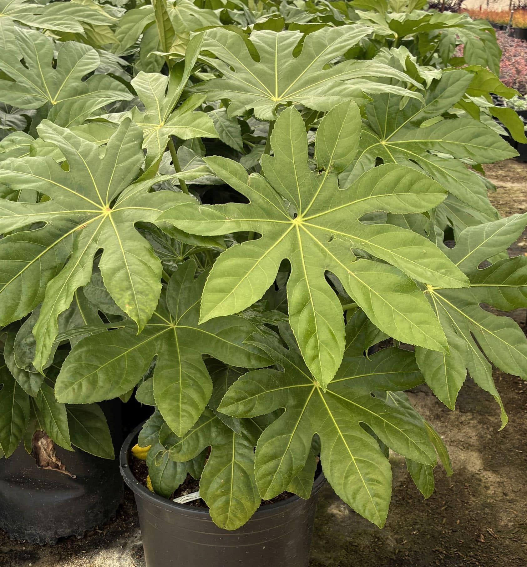Aralia sieboldii (Fatsia japonica) is prized for large, glossy, lobed leaves and white flowers in fall and black fruits in late winter to spring. Ideal as a shady screen, hedge, container, foundation plant. Thrives in shade to part shade, avoid hot sun. Moderate/regular watering, but adaptable to dry shade once established. Adapts to most soil types, but prefers to be in well-drained soil. Deer-resistant. Cold hardy to 0°F.