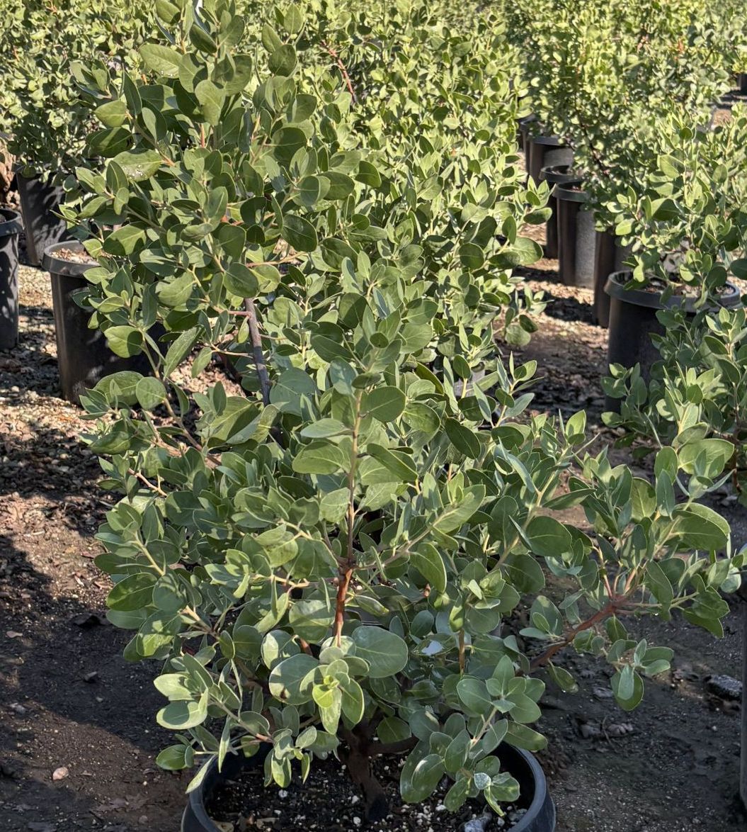 Arctostaphylos manzanita ‘Dr. Hurd’ is a fast-growing, evergreen shrub or small tree featuring glossy, light green foliage, smooth, mahogany-red bark and blooming with white, urn-shaped, fragrant flowers in winter/early spring. It is often pruned into a small tree to showcase its sculptural, twisting trunk. Ideal as a screen, hedge, focal point specimen, or a screening plant. Thrives in full sun to partial shade (especially when in hot inland climates.) It has low water needs once established; one of the most garden-tolerant manzanitas, meaning it can handle occasional summer irrigation better than other species. Highly adaptable to clay, sand, loam, and rocky soils, but requires excellent drainage. Verticillium wilt-resistant. Fire-resistant when maintained. Deer and rabbit-resistant. Cold hardy to 10°F.