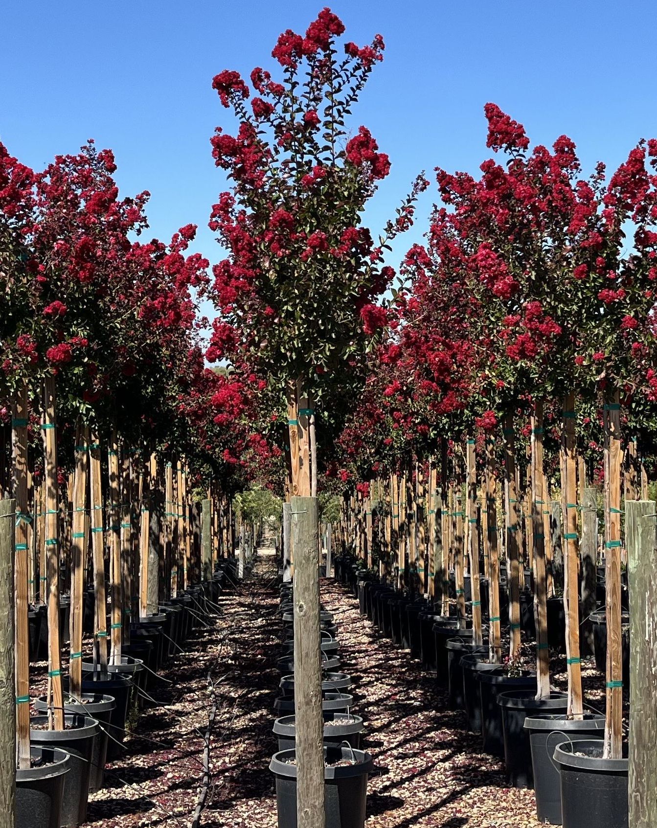 Lagerstroemia indica ‘Dynamite’® is a popular deciduous shrub/small tree cultivar. In summer, true red flowers appear. Foliage emerges red, turning green in summer, and orange-red in fall. It has very good heat/drought tolerance, thriving in full sun and in soil with good drainage. Ideal for accents, hedges, or screens in well-drained soil.